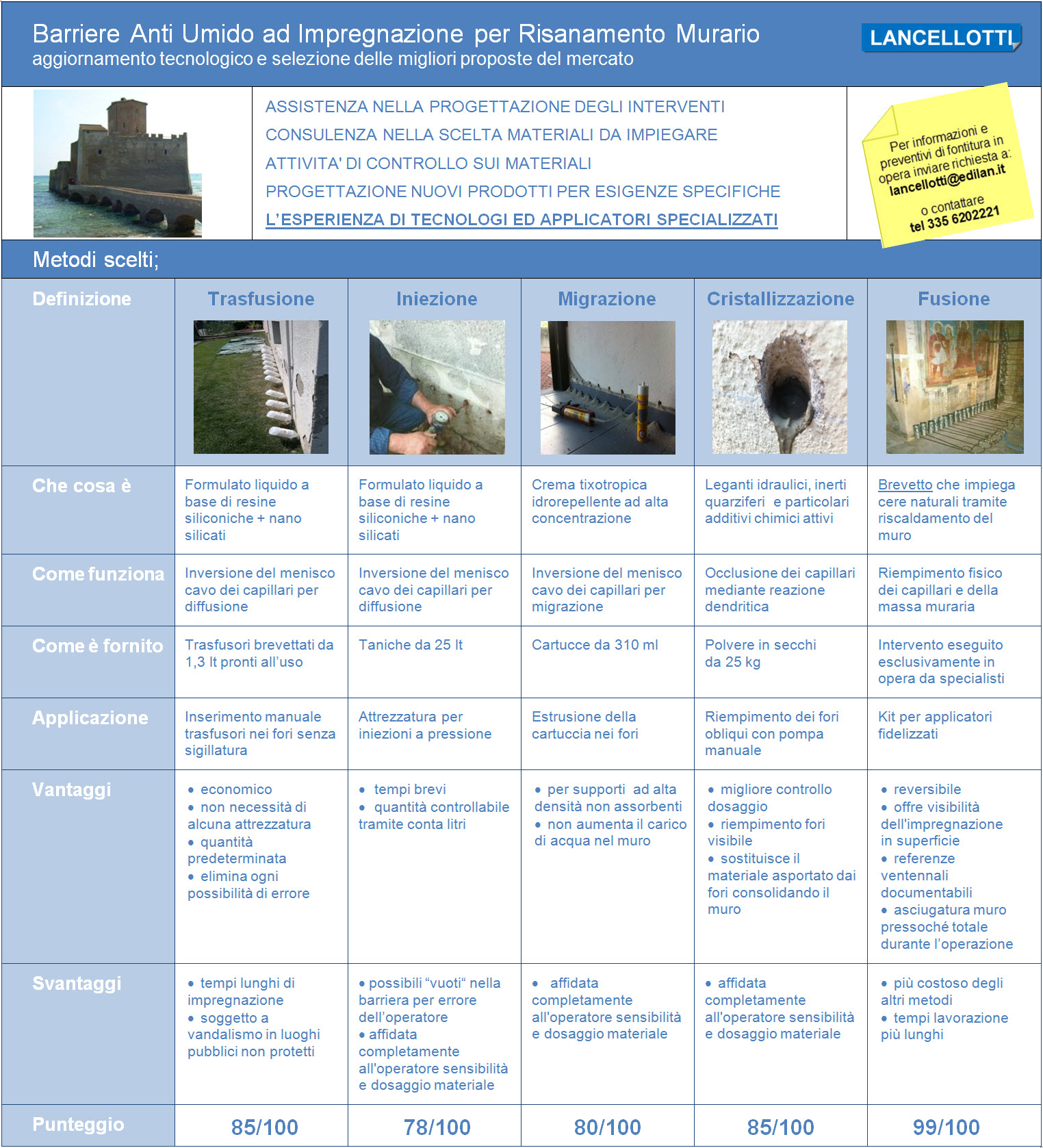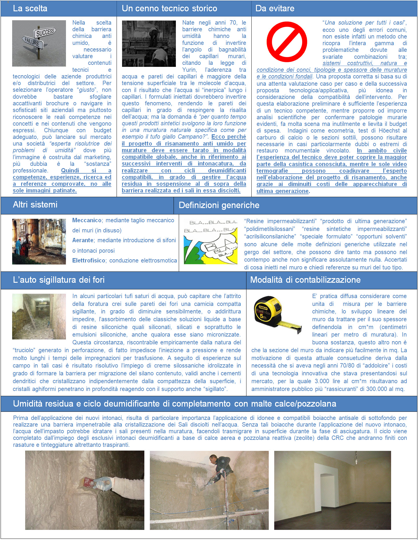 | Nella scelta della barriera chimica anti umido, è necessario valutare i contenuti tecnici e tecnologici delle aziende produttrici e/o distributrici del settore. Per selezionare l’operatore “giusto”, non dovrebbe bastare sfogliare accattivanti brochure o navigare in sofisticati siti aziendali ma piuttosto riconoscere le reali competenze nei concetti e nei contenuti che vengono espressi. Chiunque con budget adeguato, può lanciare sul mercato una società “esperta risolutrice dei problemi di umidità” dove più l’immagine è costruita dal marketing, più dubbia è la “sostanza” professionale. Quindi si a competenze, esperienze, ricerca ed a referenze comprovate, no alle sole immagini patinate. | Nate negli anni 70, le barriere chimiche anti umidità hanno la funzione di invertire l’angolo di bagnabilità dei capillari murari, citando la legge di Yurin, l’aderenza tra acqua e pareti dei capillari è maggiore della tensione superficiale tra le molecole d’acqua, con il risultato che l’acqua si “inerpica” lungo i capillari. I formulati iniettati dovrebbero invertire questo fenomeno, rendendo le pareti dei capillari in grado di respingere la risalita dell’acqua; ma la domanda è “per quanto tempo questi prodotti sintetici svolgono la loro funzione in una muratura naturale specifica come per esempio il tufo giallo Campano?”. Ecco perché il progetto di risanamento anti umido per murature deve essere tarato in modalità compatibile globale, anche in riferimento ai successivi interventi di intonacatura, da realizzare con cicli deumidificanti compatibili, in grado di gestire l’acqua residua in sospensione al di sopra della barriera realizzata ed i sali in essa disciolti. | “Una soluzione per tutti i casi”, ecco uno degli errori comuni, non esiste infatti un metodo che ricopra l’intera gamma di problematiche dovute alle svariate combinazioni tra; sistemi costruttivi, natura e condizione dei conci, tipologie e spessore delle murature e le condizioni fondali. Una proposta corretta si basa su di una attenta valutazione caso per caso e della successiva proposta tecnologica/applicativa, più idonea in considerazione della compatibilità dell’intervento. Per questa elaborazione preliminare è sufficiente l’esperienza di un tecnico competente, mentre proporre od imporre analisi scientifiche per confermare patologie murarie evidenti, fa molta scena ma inutilmente e lievita il budget di spesa. Indagini come ecometria, test di Höechst al carburo di calcio o le sezioni sottili, possono risultare necessarie in casi particolarmente dubbi o estremi di restauro monumentale vincolato. In ambito civile l’esperienza del tecnico deve poter coprire la maggior parte della casistica conosciuta, mentre le sole video termografie possono coadiuvare l’esperto nell’elaborazione del progetto di risanamento, anche grazie ai diminuiti costi delle apparecchiature di ultima generazione. |