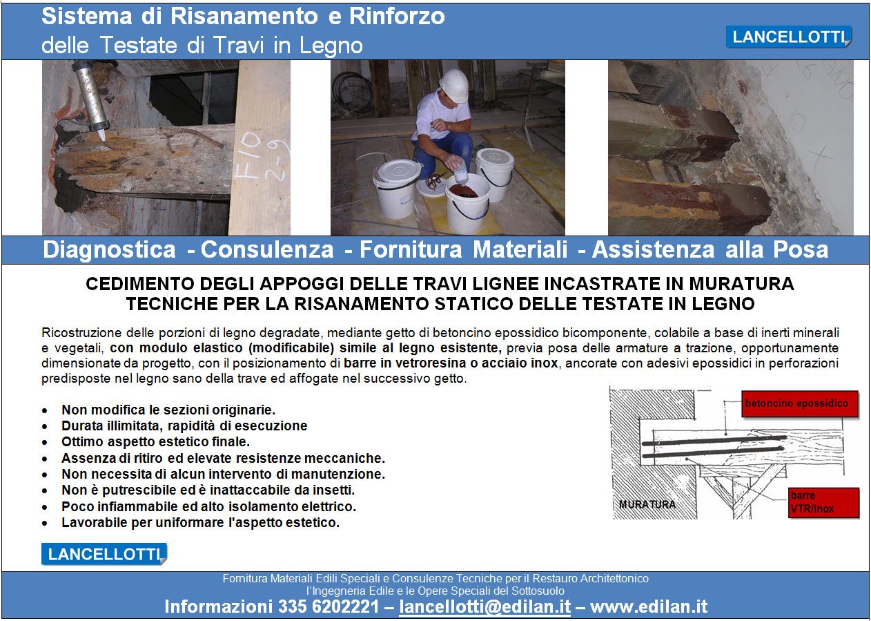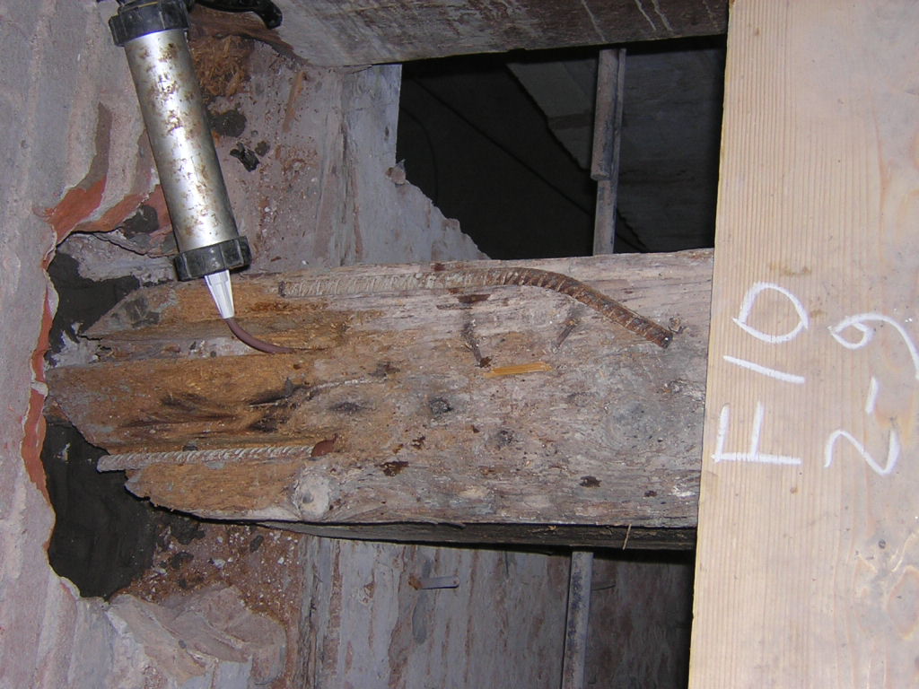 Ricostruzione delle porzioni di legno degradate, mediante getto di betoncino epossidico bicomponente, colabile a base di inerti minerali e vegetali, con modulo elastico (modificabile) simile al legno esistente, previa posa delle armature a trazione, opportunamente dimensionate da progetto, con il posizionamento di barre in vetroresina o acciaio inox, ancorate con adesivi epossidici in perforazioni predisposte nel legno sano della trave ed affogate nel successivo getto.