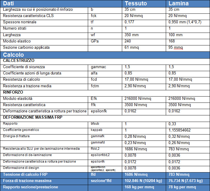 La tabella confronta due rinforzi flessionali eseguiti su una trave emergente in calcestruzzo armato larga 35 cm e compara i risultati prestazionali per mmq di sezione in carbonio applicata.