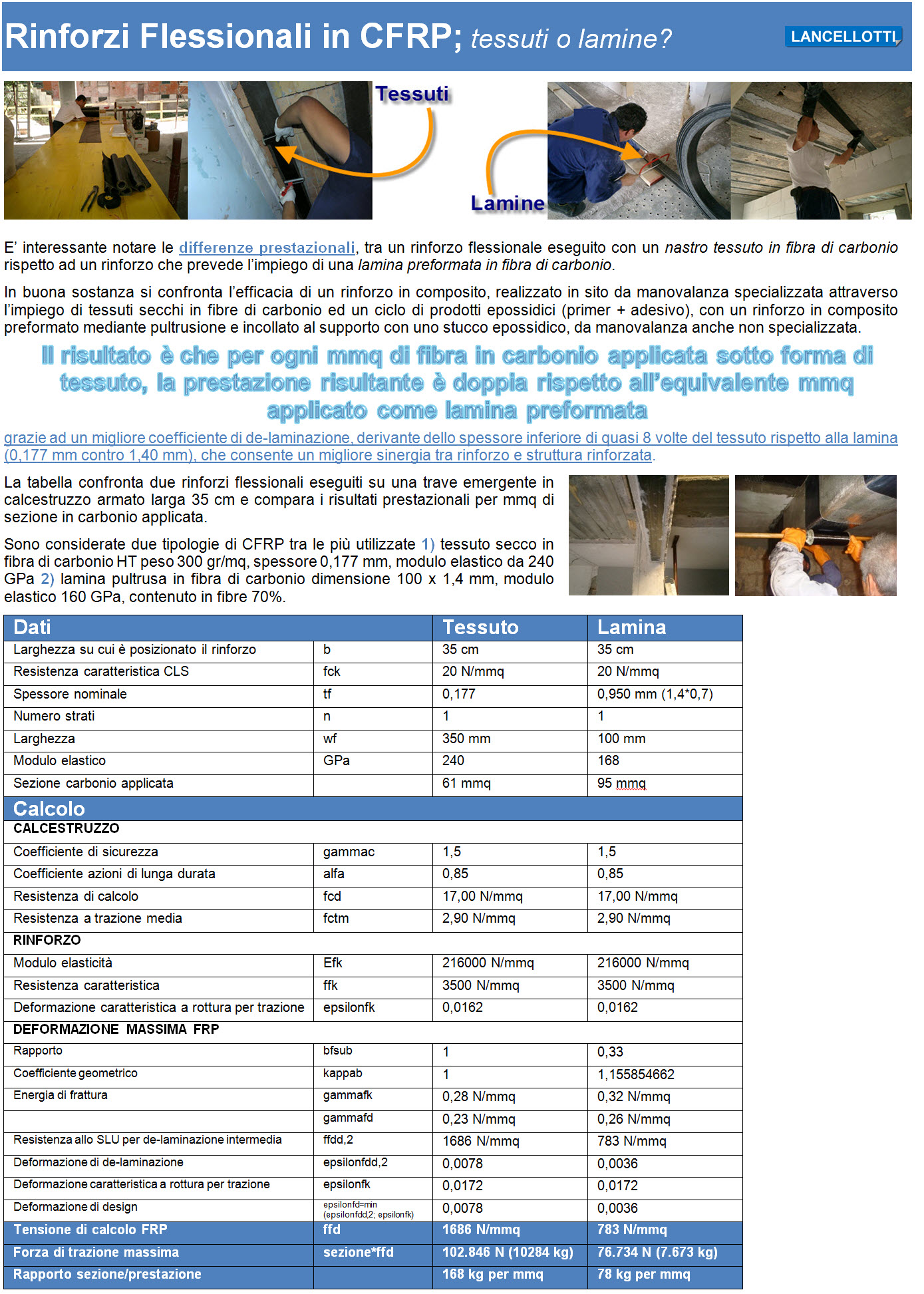 E’ interessante notare le differenze prestazionali, tra un rinforzo flessionale eseguito con un nastro tessuto in fibra di carbonio rispetto ad un rinforzo che prevede l’impiego di una lamina preformata in fibra di carbonio.