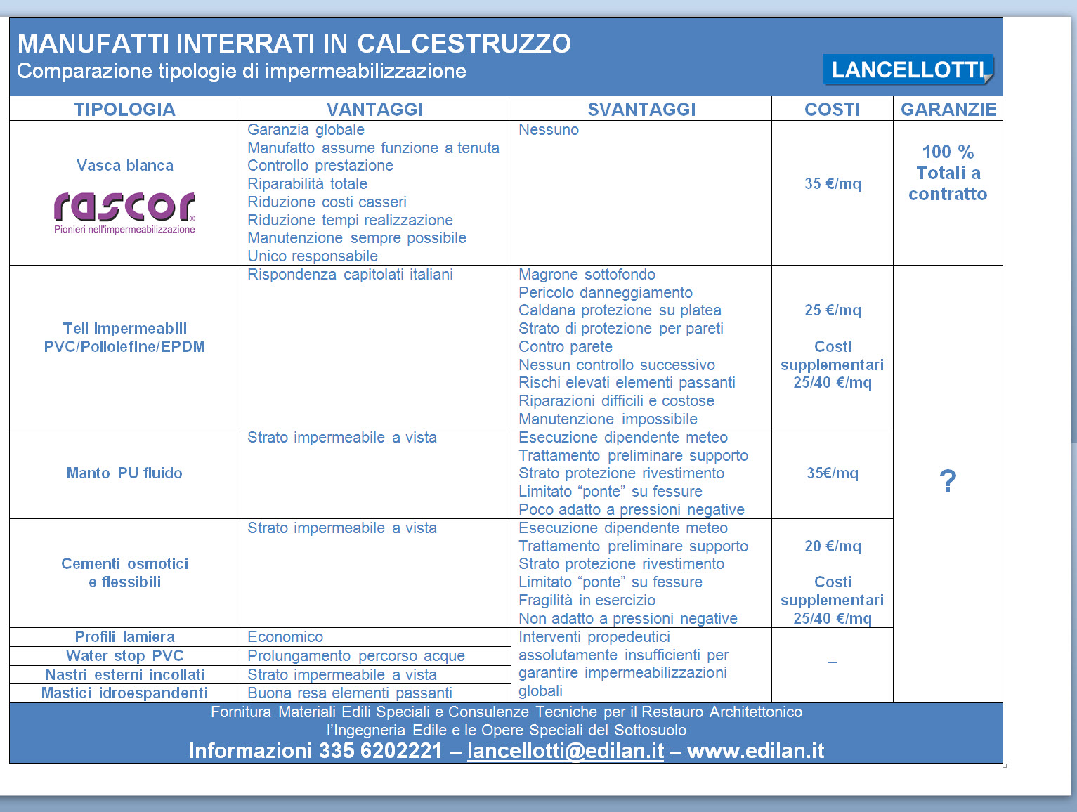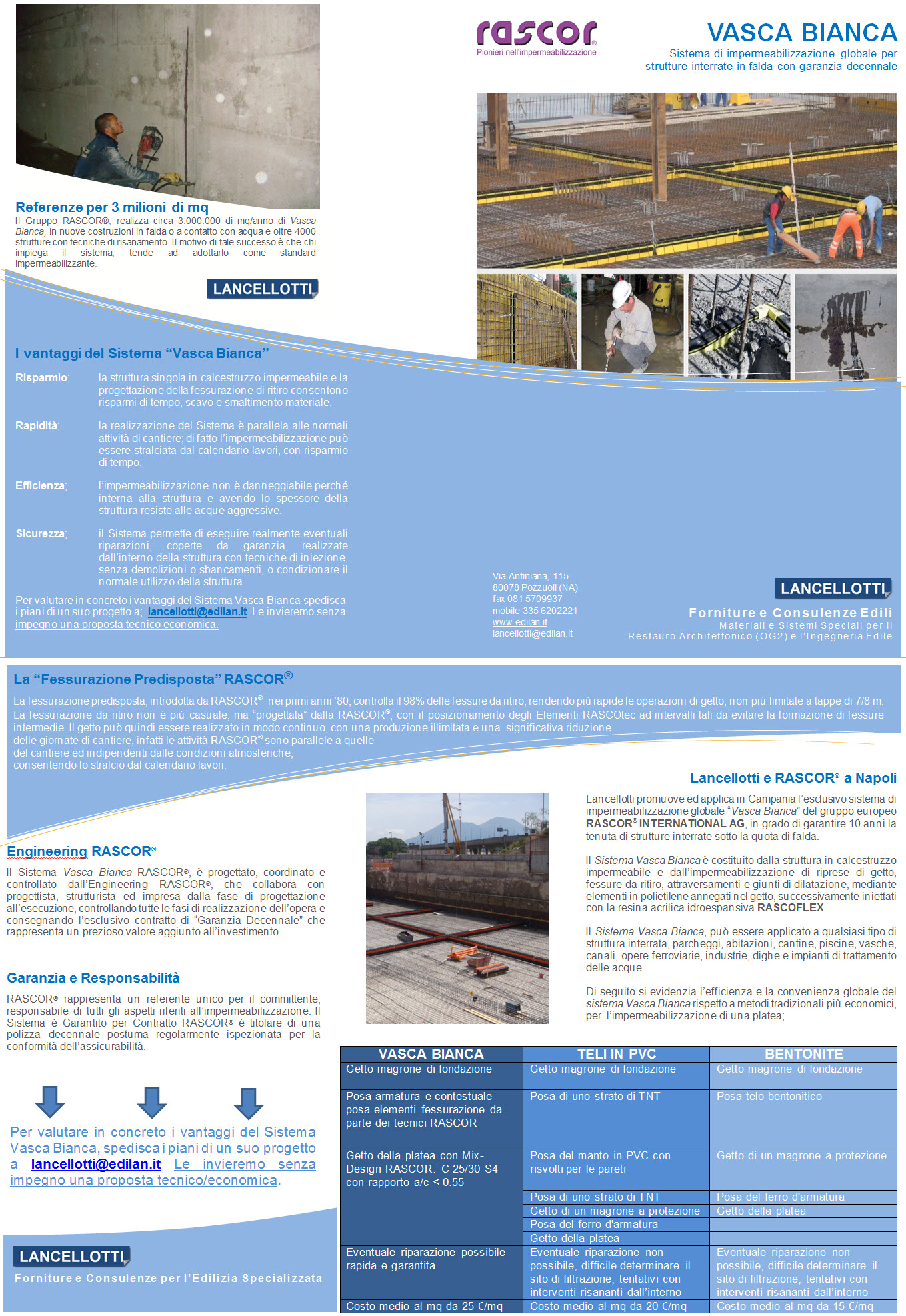 Lancellotti promuove ed applica in Campania l’esclusivo sistema di impermeabilizzazione globale “Vasca Bianca” del gruppo europeo RASCOR® INTERNATIONAL AG, in grado di garantire 10 anni la tenuta di strutture interrate sotto la quota di falda.