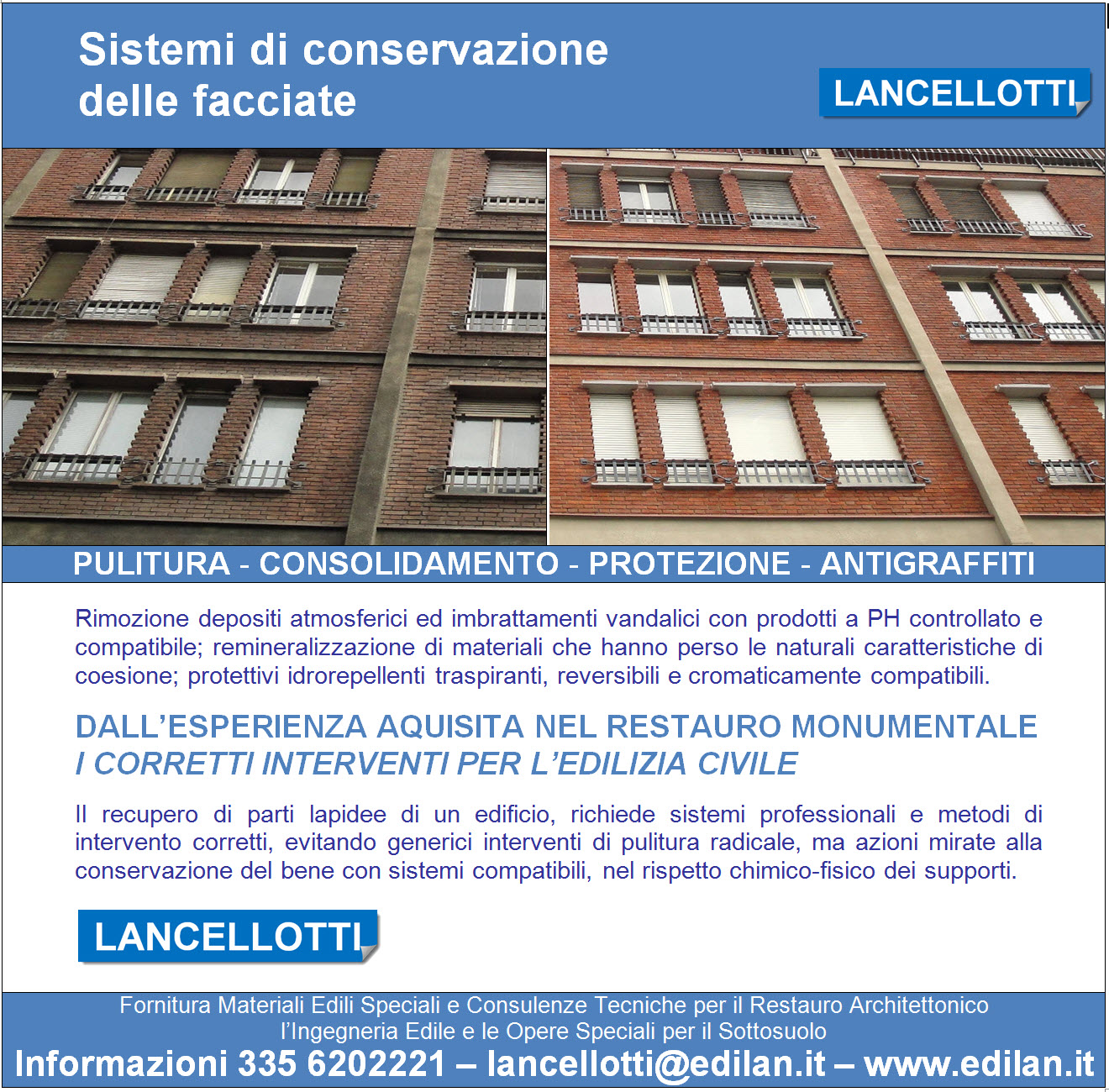 Rimozione depositi atmosferici ed imbrattamenti vandalici con prodotti a PH controllato e compatibile; remineralizzazione di materiali che hanno perso le naturali caratteristiche di coesione; protettivi idrorepellenti traspiranti, reversibili e cromaticamente compatibili.