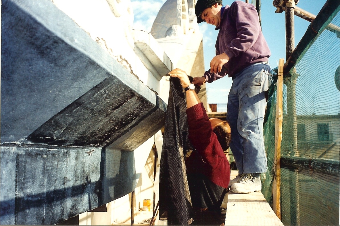 La mia proposta dopo la ricostruzione delle porzioni mancanti e di quelle non dotate di sufficiente tenuta con malte a basso modulo elastico compatibili, fu quella di “fasciare” il manufatto risanato con tessuti in carbonio di peso leggero laminati in sito con adesivi epossidici.