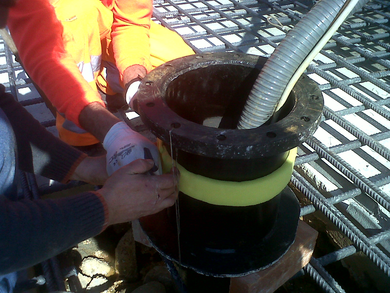 Da personale specializzato Rascor® verrà iniettata in pressione negli elementi RASCOtec, la miscela bi componente (A+B) RASCOflex®, in modo da saturare i canali per le riprese di getto e gli elementi per la fessurazione programmata precedentemente posizionati all’interno del manufatto.