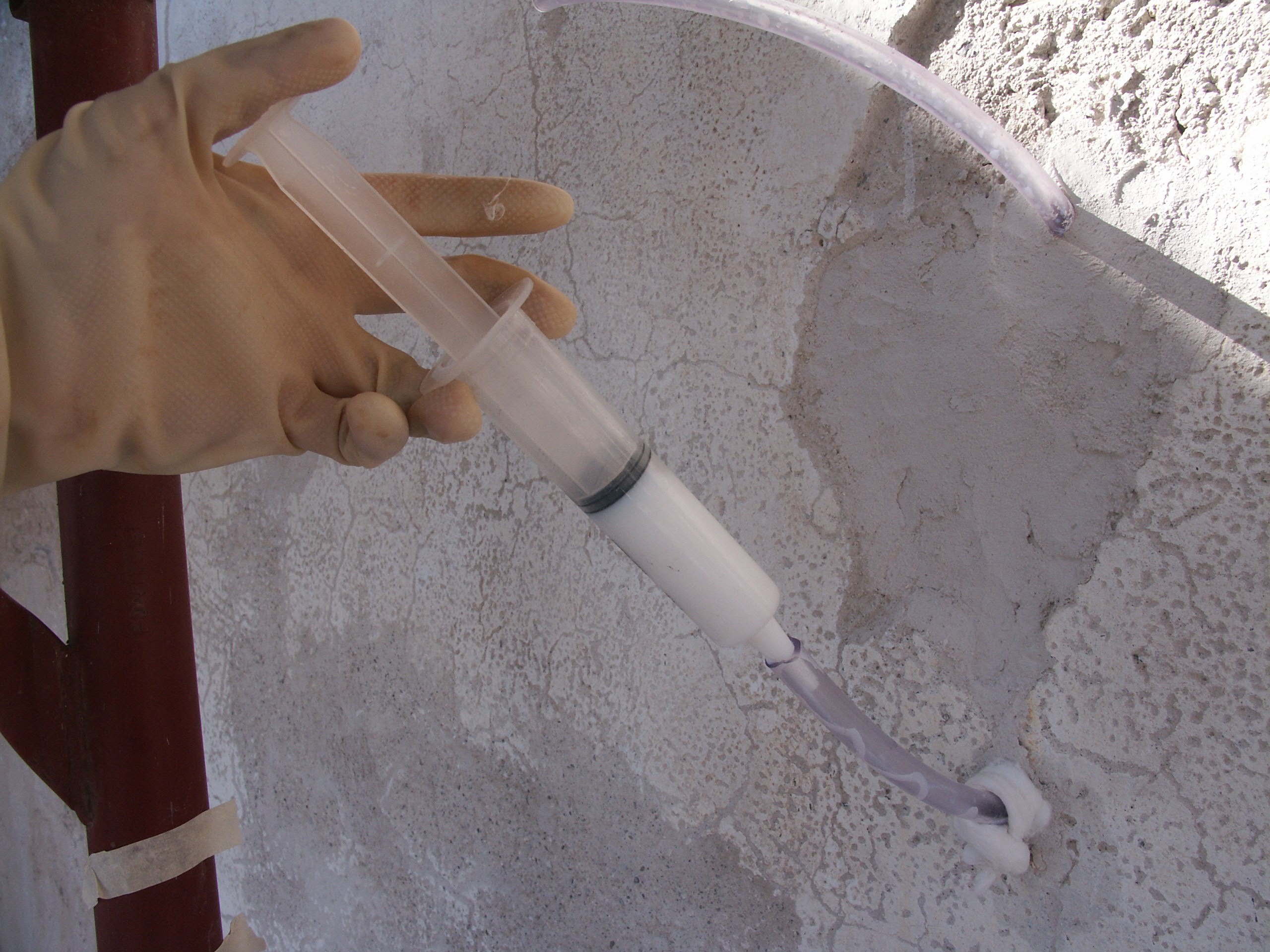 - accurata pulitura dei fori, con aria compressa e dove necessario con acqua demineralizzata, delle cavità createsi tra l’intonaco finale e l’arriccio e/o la muratura di supporto, con aspirazione del materiale polverulento e malta disgregata, umidificazione delle cavità con iniezioni, a mezzo di siringhe, di acqua demineralizzata, da ripetere più volte, per favorire l’adesione del prodotto successivamente iniettato