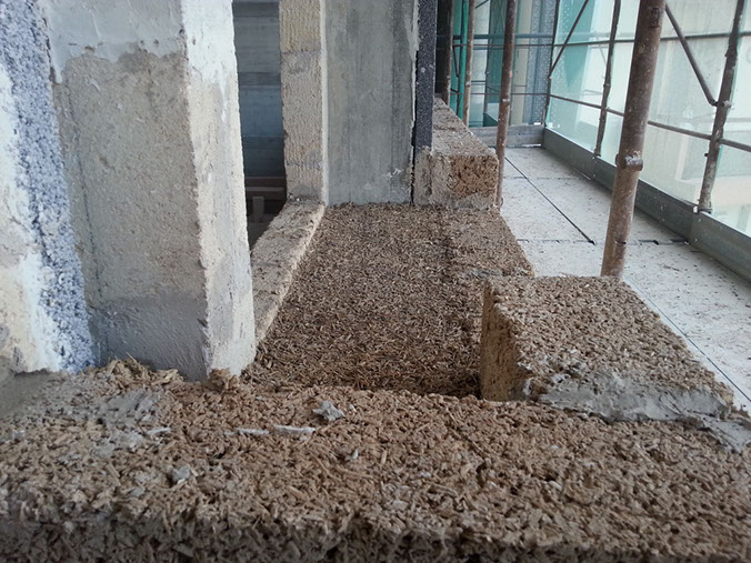 Attualmente si sta procedendo alla posa del BIOMATTONE con la malta a calce canapa NATURAL BETON 500 impastata in betoniera con due diversi leganti; calce aerea (colore bianco in foto) e un legante idraulico di calce aerea e pozzolana zeolite micronizzata (colore marroncino in foto).