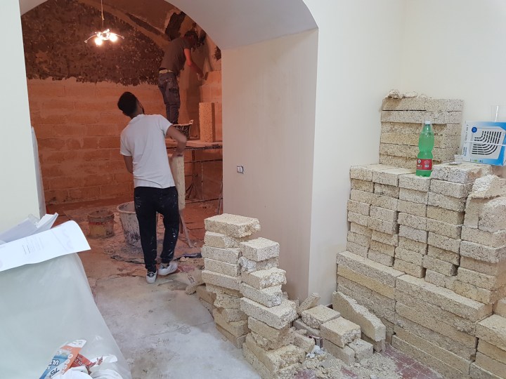 In un piccolo cantiere nel centro storico a Napoli il progettista ha scelto il BIOMATTONE in calce canapa per risanare il problema “umidità” delle murature in tufo semi interrate, al paramento esterno.