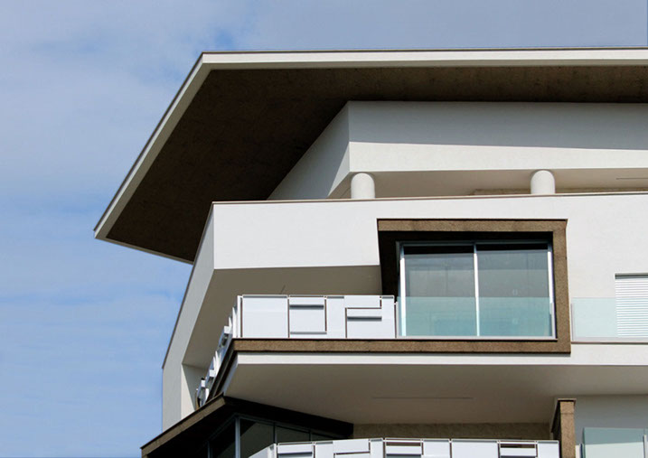 fruibile alla pari dei balconi. Altro tema caratterizzante questo edificio è la presenza di una copertura “a vela”, il cui intradosso è completamente rivestito in sughero bruno a faccia vista al pari delle pareti cieche delle serre, copertura appositamente inclinata in direzione Sud/Sud-Est al fine di alloggiare, in modo integrato al linguaggio formale ed architettonico dell’edificio, i pannelli per il solare termico e per il fotovoltaico di ciascun appartamento.