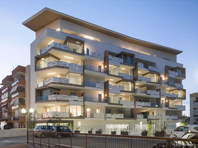 2012 – 2016 “Case di Luce” – Bisceglie – Edificio residenziale nZEB per 40 abitazioni e locali commerciali con tecnologie costruttive in Biomattone di Canapa e Calce e sistema passivo con serre solari.