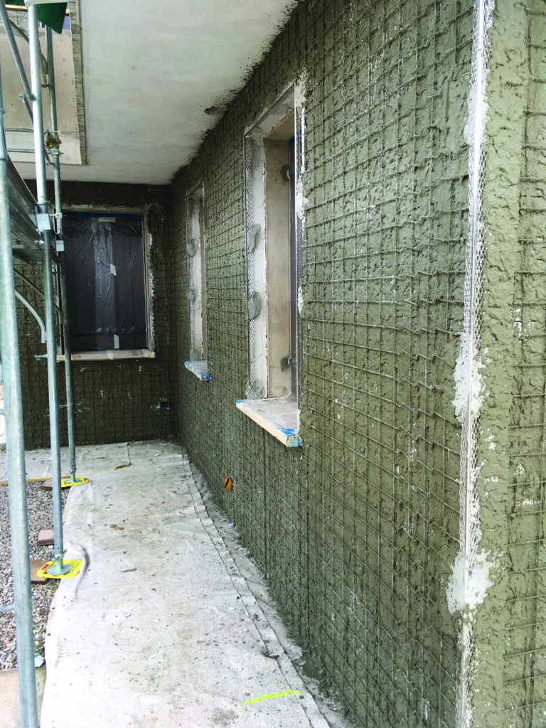 RASATURA: Rasante pozzolanico premiscelato ZEOTONACHINO FR della ZEOCALCE srl, applicato in due mani con annegamento di una rete in fibra di vetro alcali-resistente.