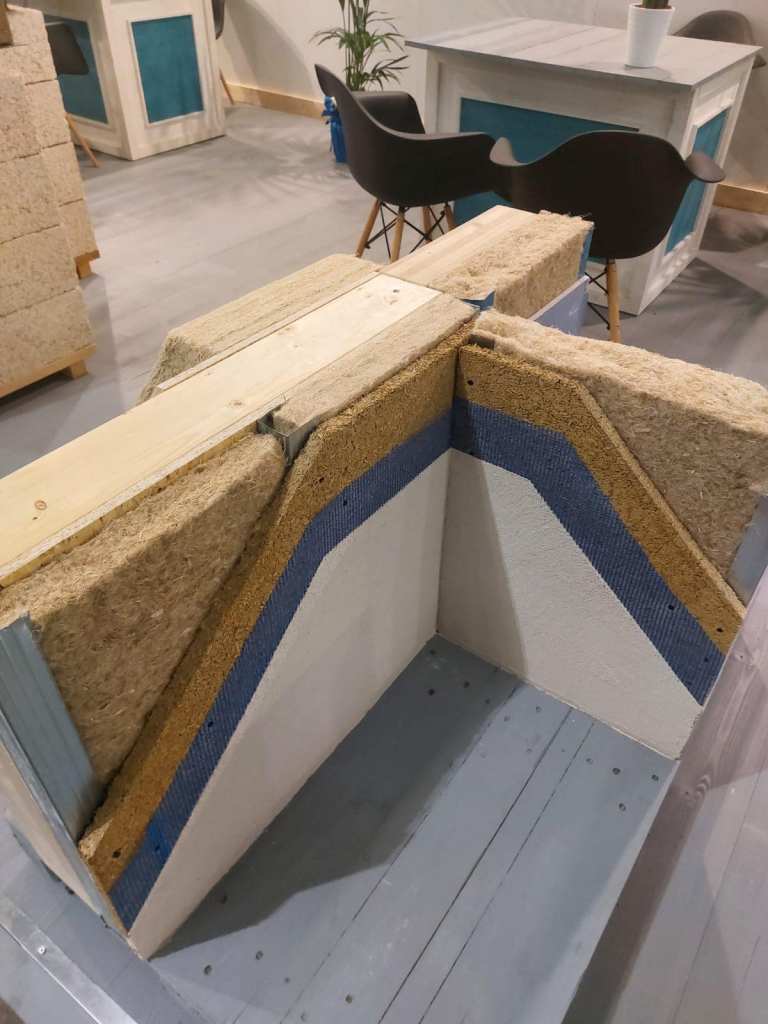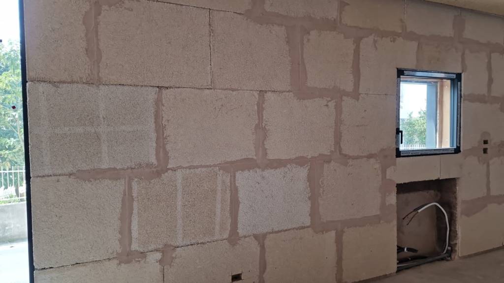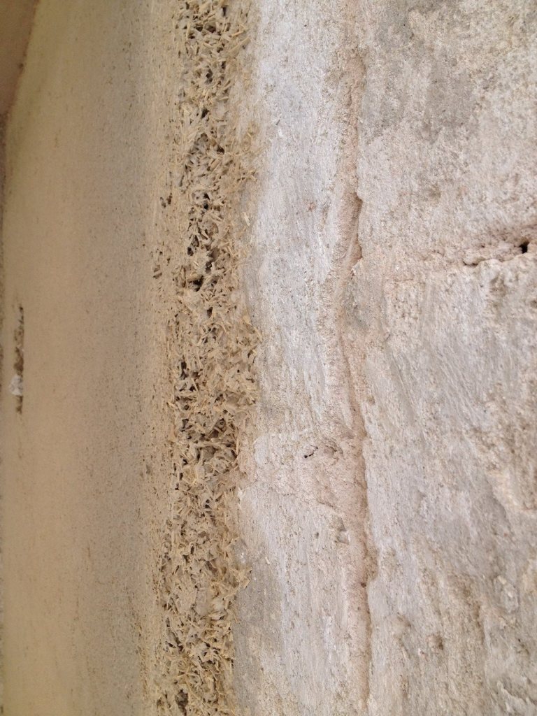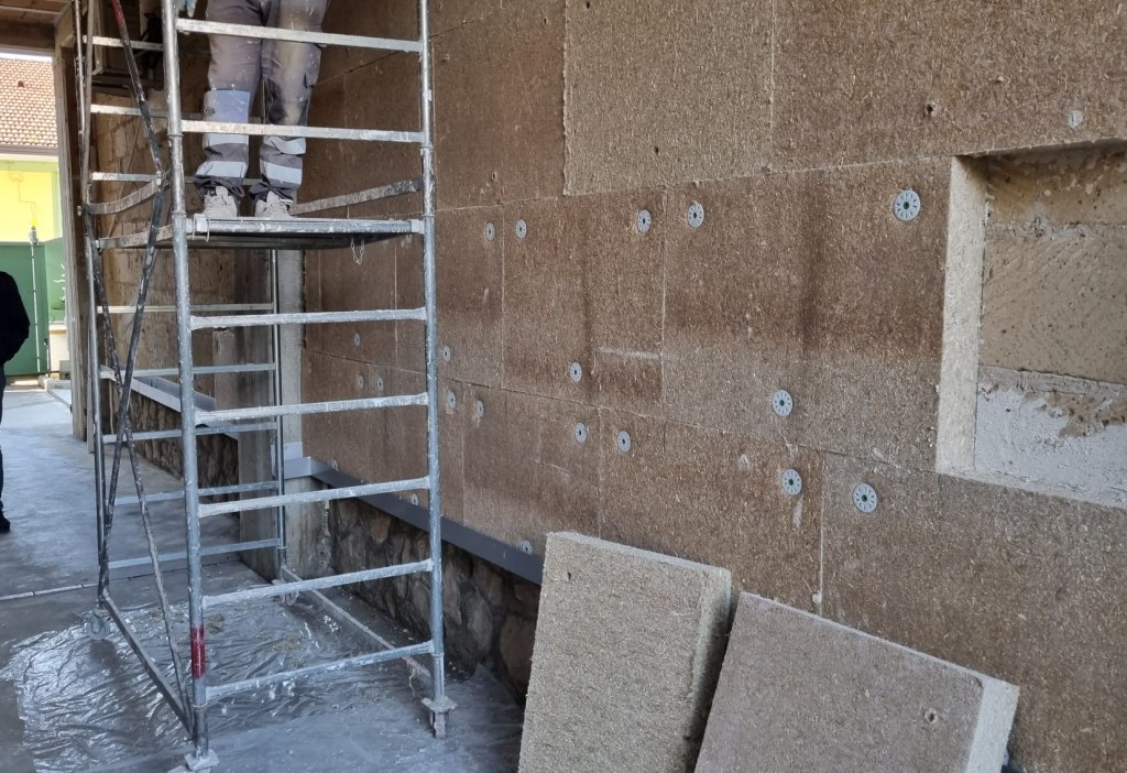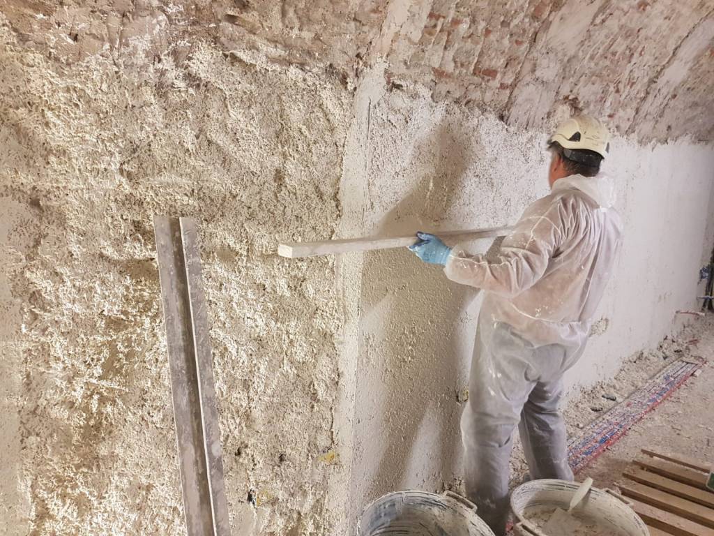 il risanamento termico/igrometrico con pannelli di spessore 10 cm in fibre di canapa applicati per incollaggio e tassellamento meccanico ai paramenti esterni e mediante la posa di termo-intonaci in canapa e calce eseguiti in alto spessore (>5 cm) alle pareti interne