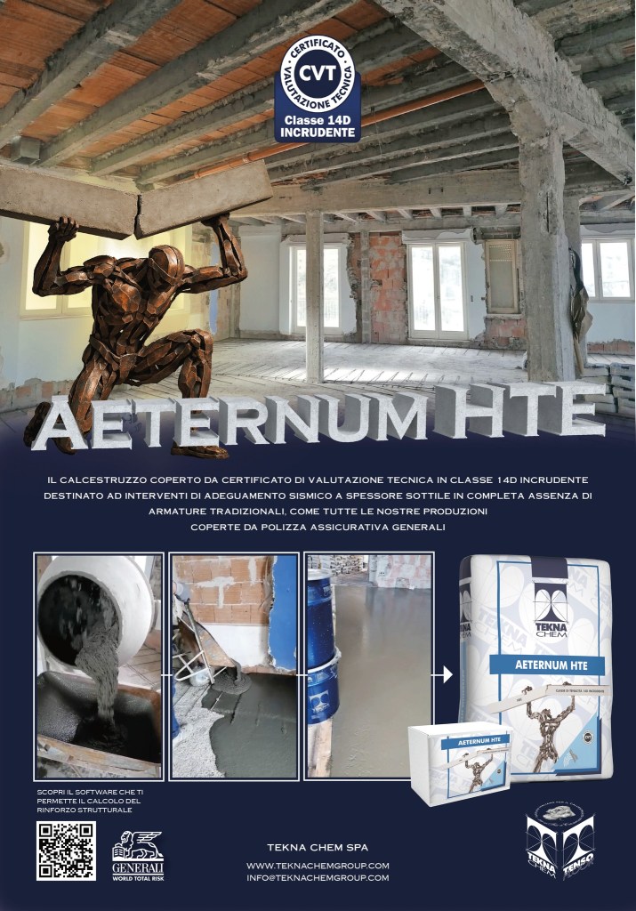 TEKNA CHEM S.p.A. già in possesso del certificato di conformità del controllo della produzione in fabbrica (FPC) N. 1305-CPR-1282 “Prodotti e sistemi per la protezione e la riparazione delle strutture di calcestruzzo” ai sensi delle EN 1504-2:2004, EN 1504-3:2005, EN 1504-4:2004 e EN 1504-6:2006, per il Prodotto AETERNUM HTE ha ottenuto la Marcatura CE per cui lo stesso è coperto da DoP N° IT0900/HTE ai sensi della EN 1504-3 come “Malta cementizia (R4-CC) per riparazione strutturale”; inoltre il prodotto, ai sensi del D.M. 17 gennaio 2018 – punto 11.1 – lettera c), ha ottenuto il Certificato di Valutazione Tecnica (CVT) , per il campo di impiego: “Calcestruzzo fibrorinforzato (FRC) per la riabilitazione delle opere strutturali in calcestruzzo armato e per la realizzazione di elementi strutturali nuovi.”